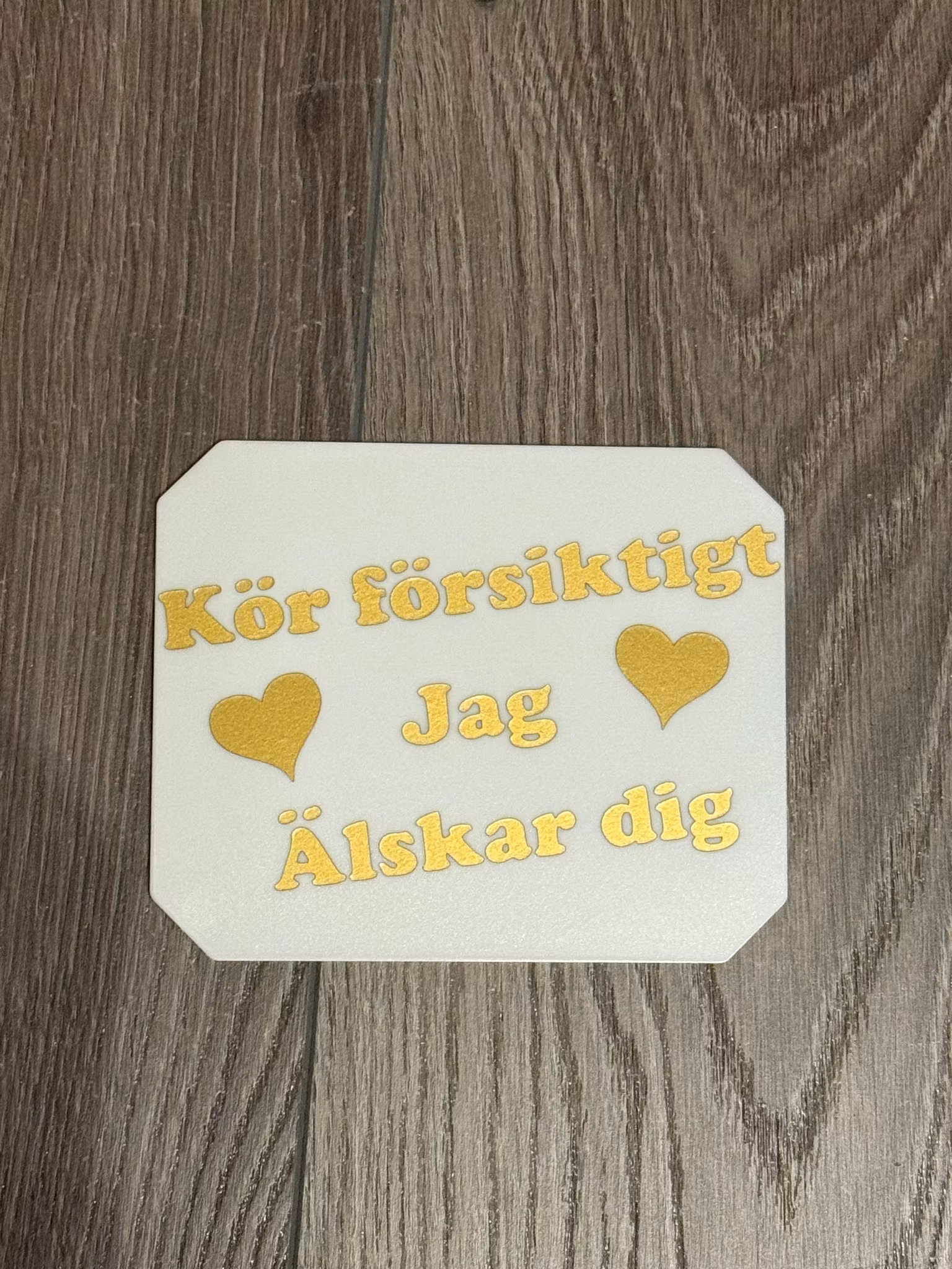 Skrapa av plast. Trycket är lagt på med skyltvinyl. Eftersom alla skraporna görs för hand kan avvikelser förekomma.