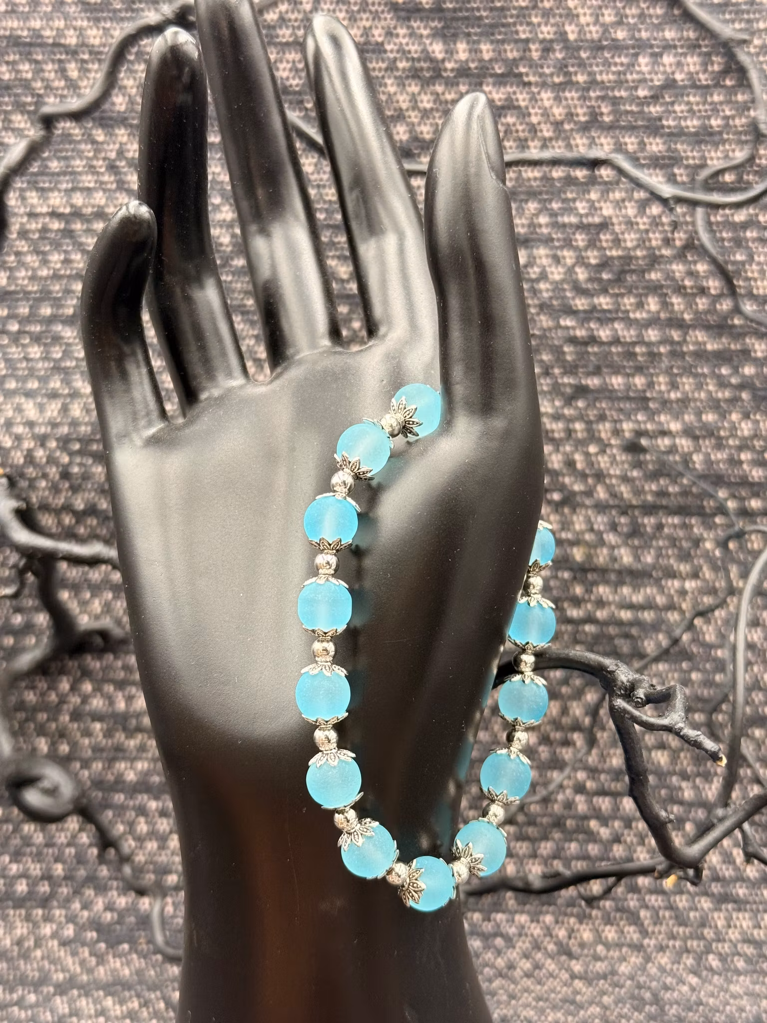 Elastiskt armband gjort av glaspärlor och mellandelar i metall.