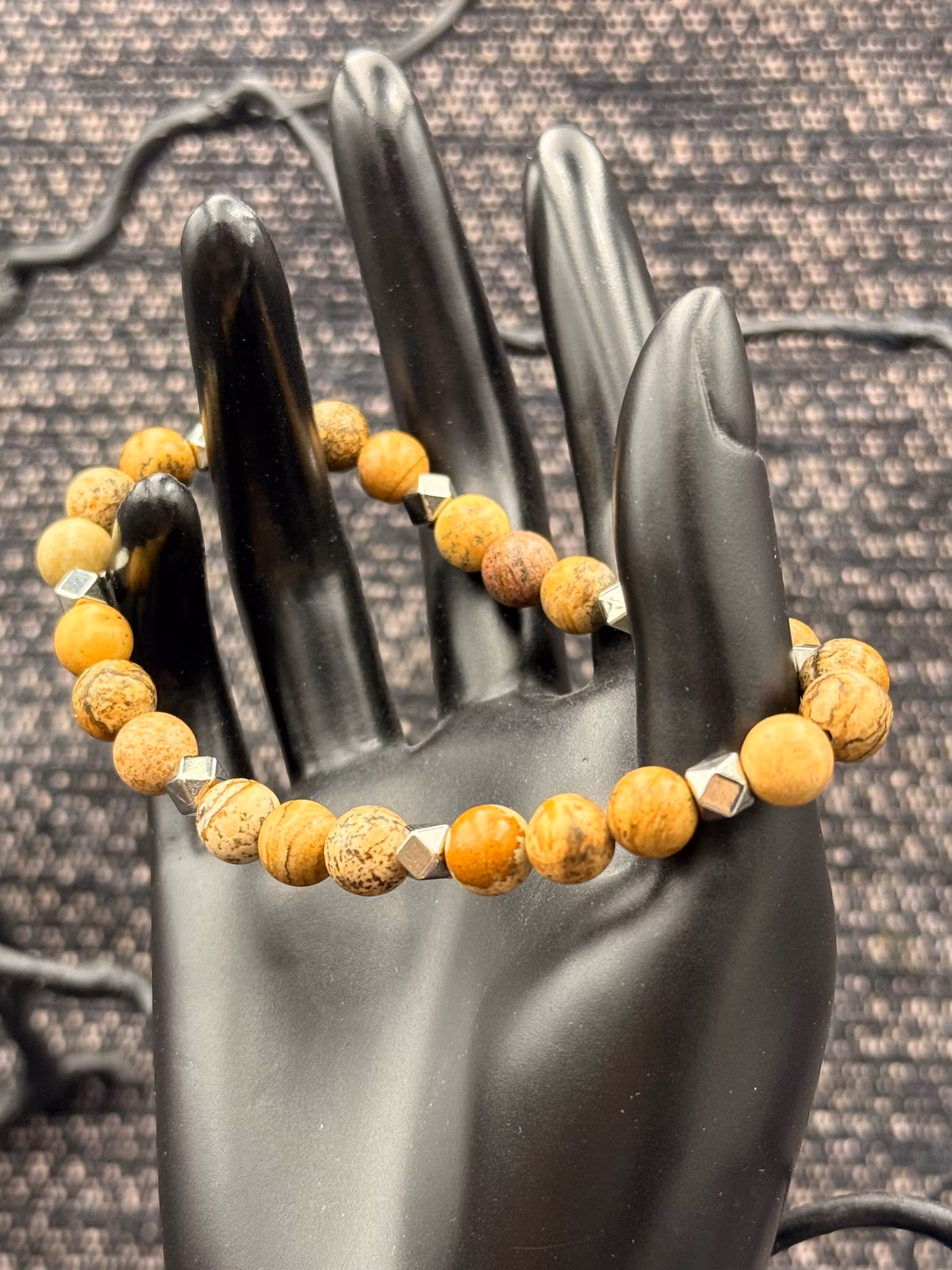 Elastiskt armband gjort av träfärgade glaspärlor och mellandelar i metall.