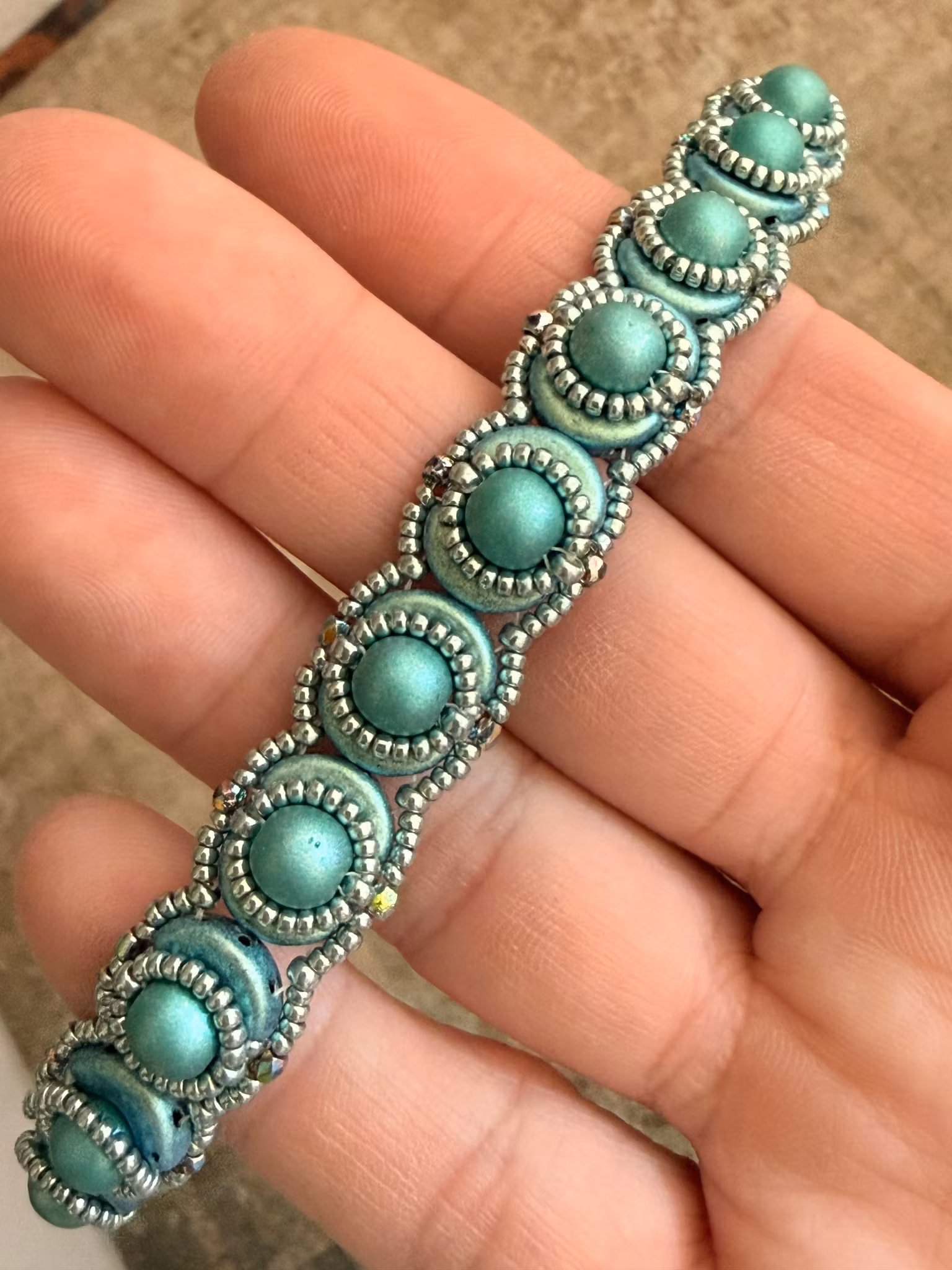 Handsytt armband av tjeckiska glaspärlor samt runda swarowskipärlor.