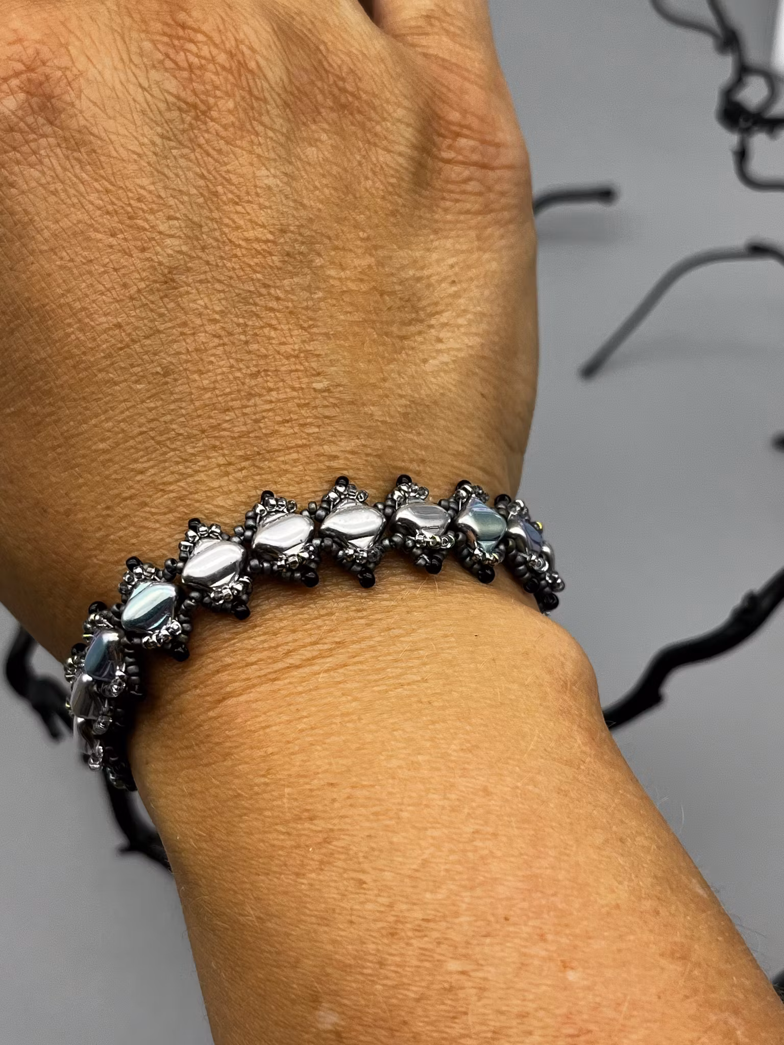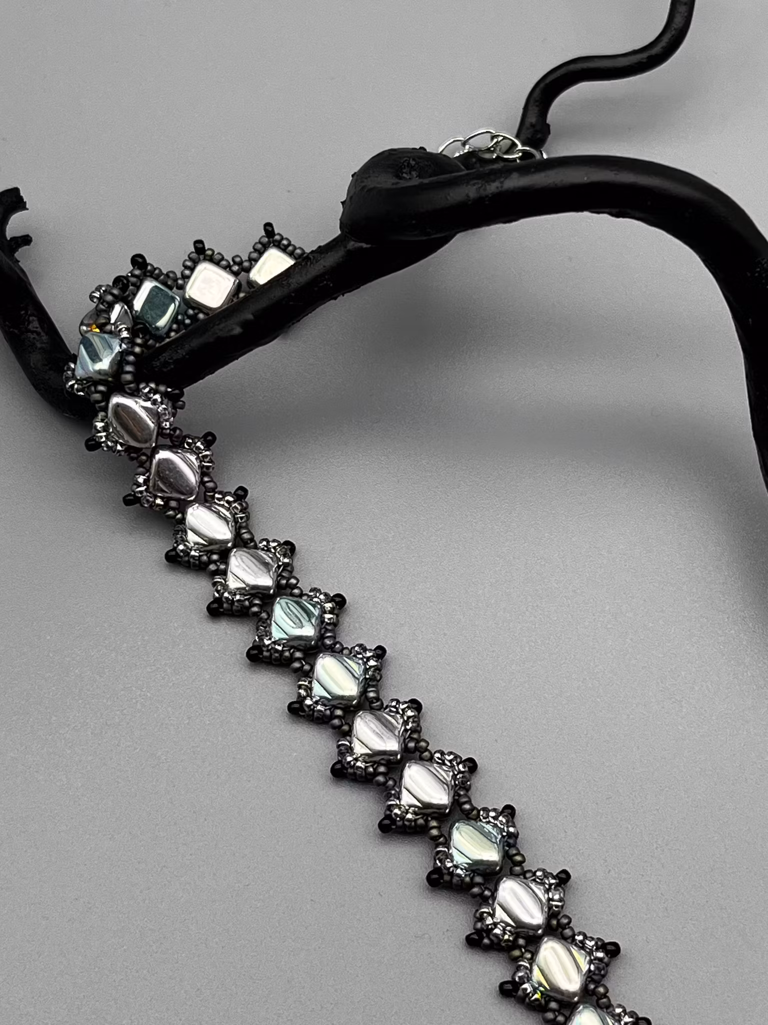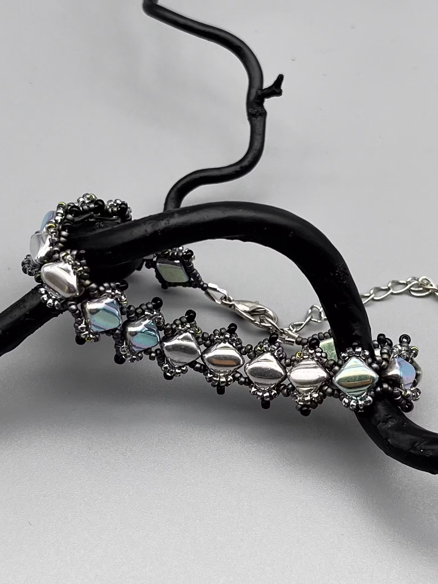 Handsytt armband av tjeckiska glaspärlor.Längd: 18 cm +5 cm förlängningskedjaca 1 cm brett.Nickelsäkert lås.Mönsterskapare: Connie Wittaker