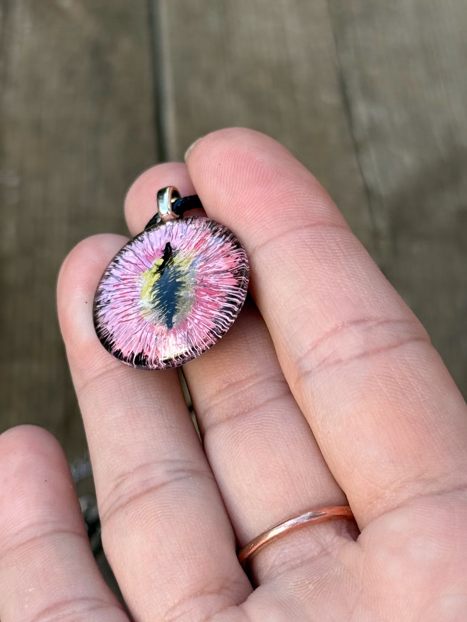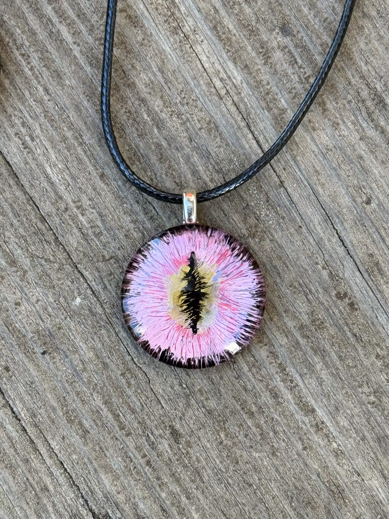 Handmålat glas inkl rem ca 50 cm. Hänget är ca 35 mm i diameter. Nickelsäker hängögla. Designer: Hemasis Helena Ström