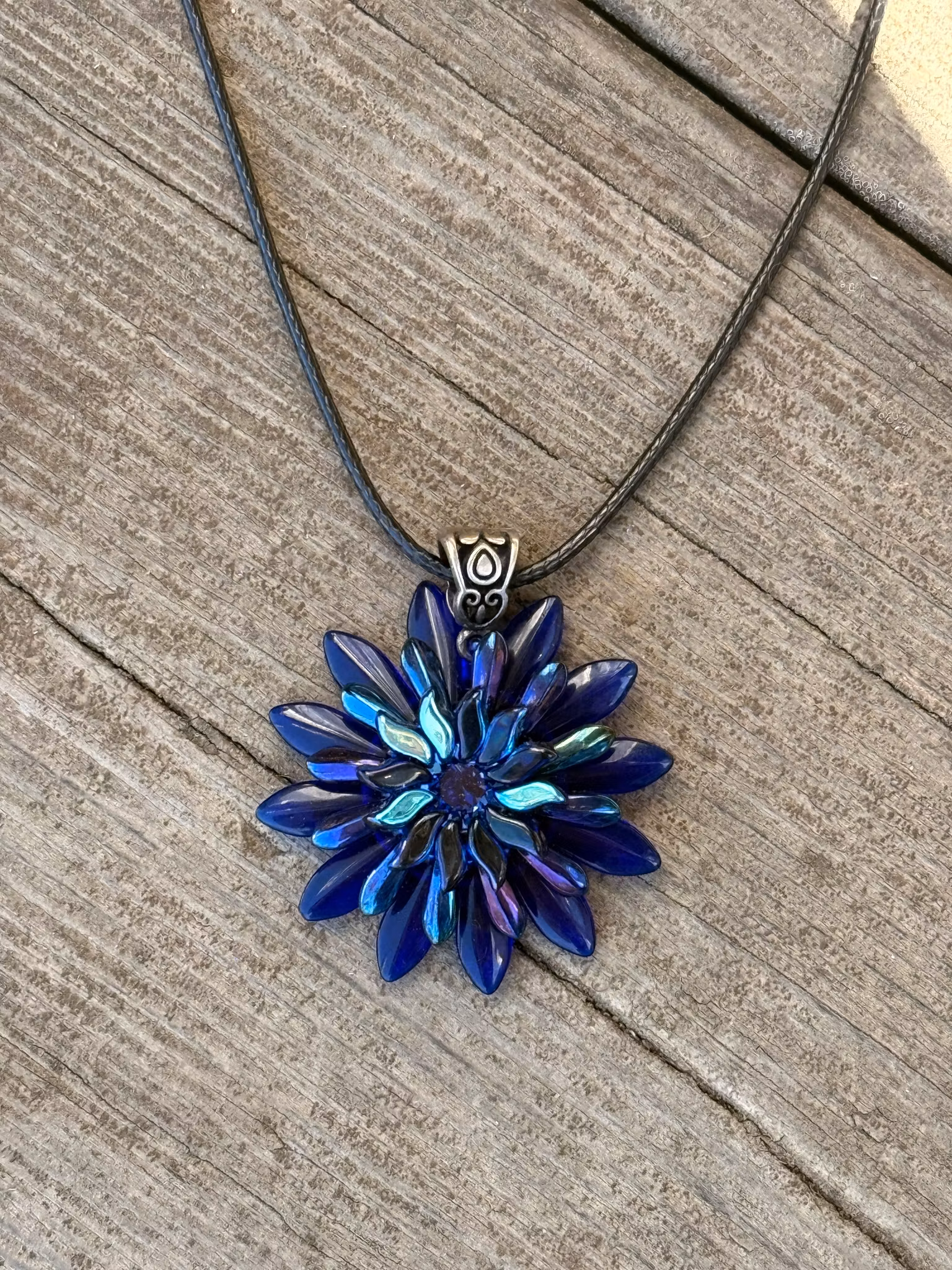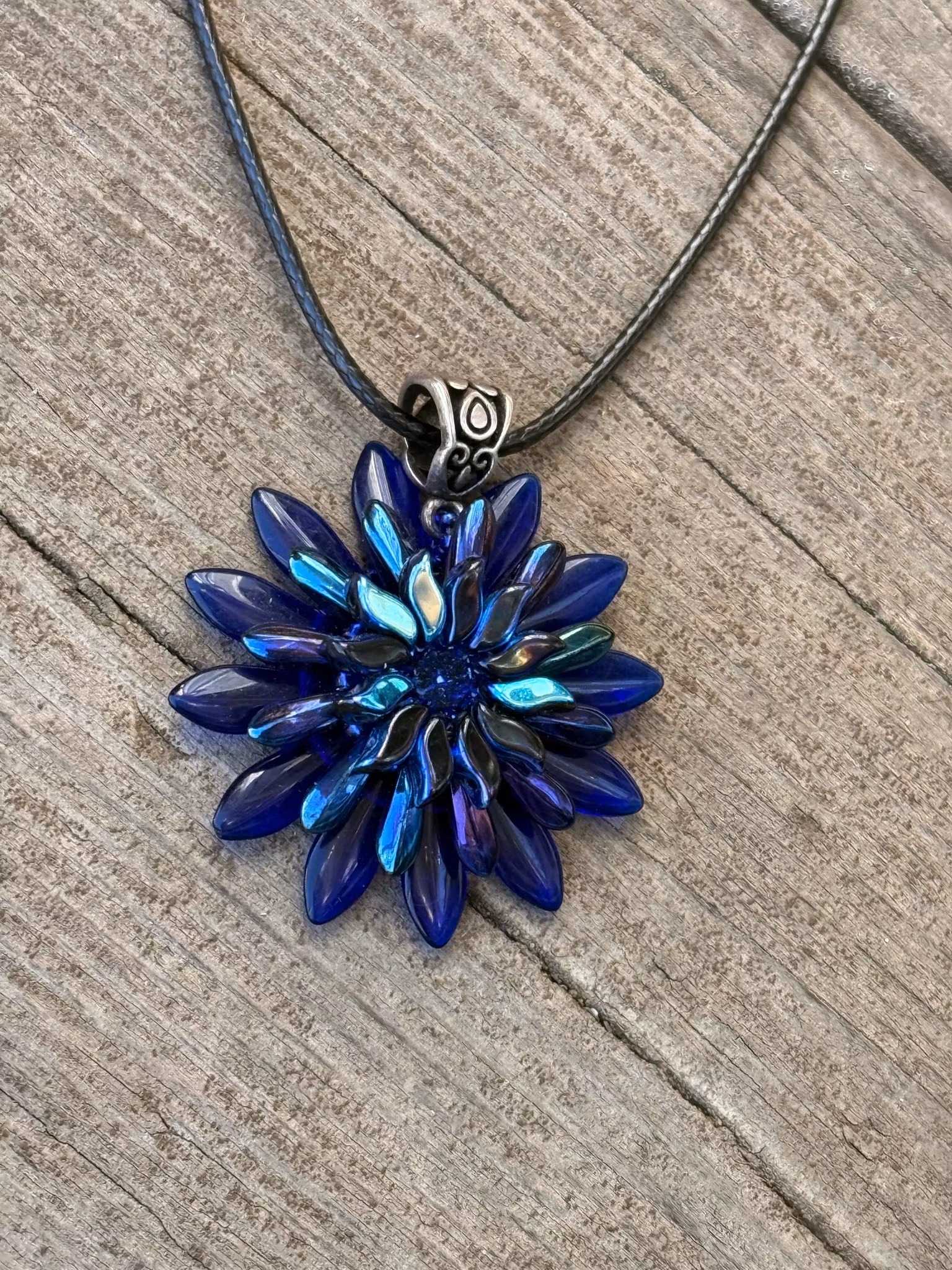 Fantastisk blomma handsydd med tjeckiska glaspärlor. 4 cm i diameter, i mitten sitter en 8 mm Swarovski chaton.