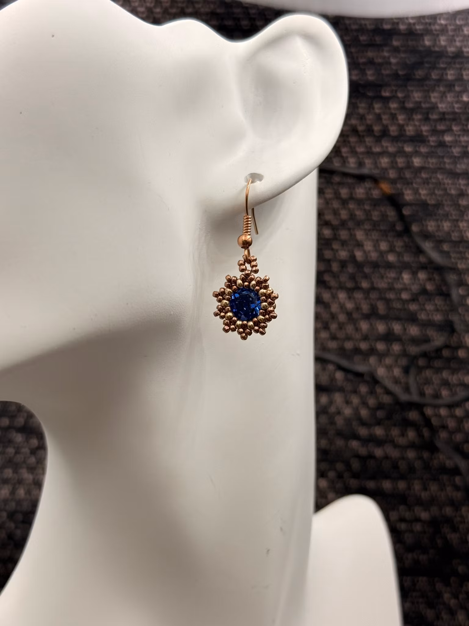 Handsydda örhängen av glaspärlor I mitten sitter en 8 mm chaton i blåttSjälva hänget är ca 25mm långt sen tillkommer kroken.