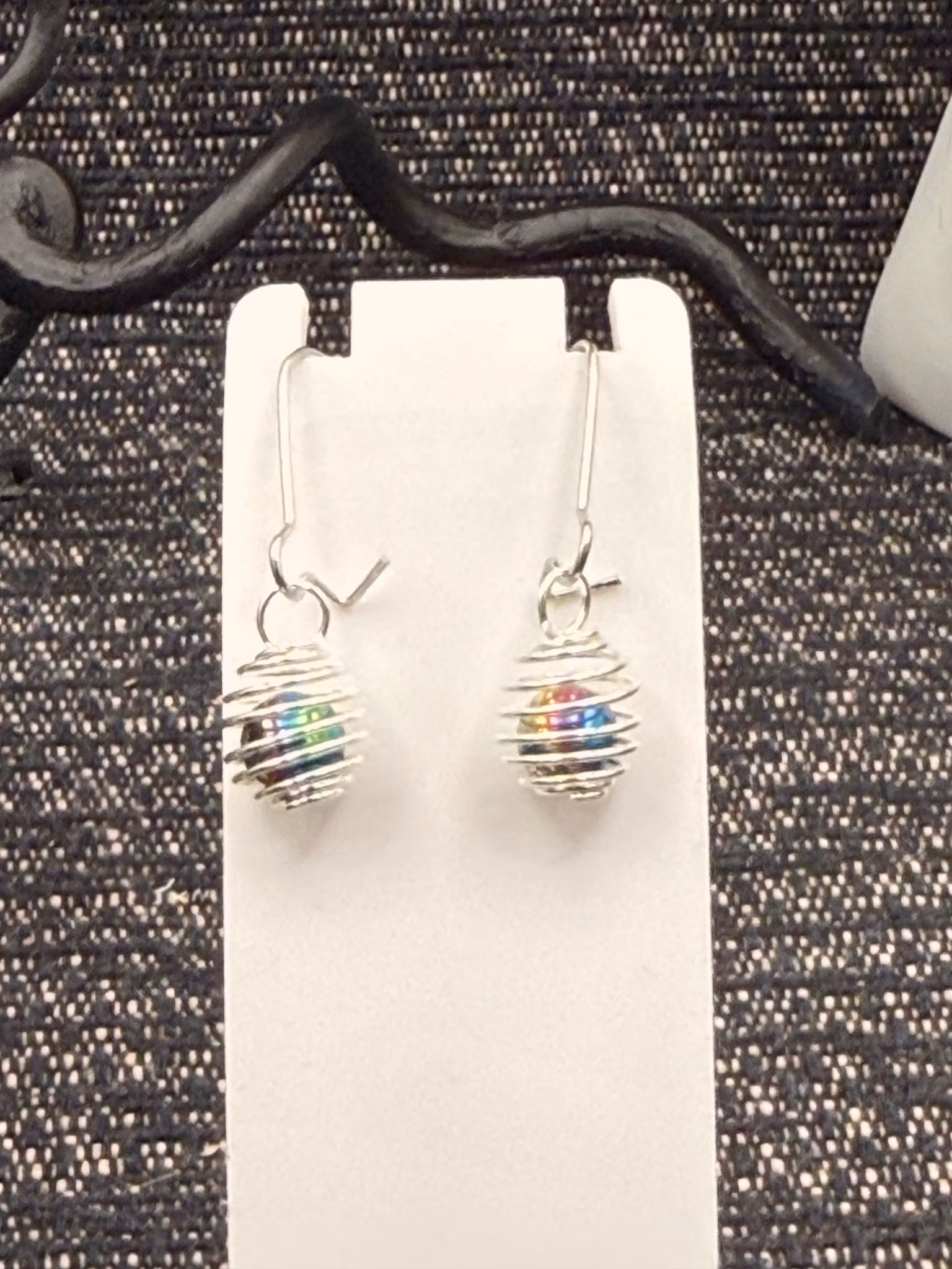 Handgjort örhänge med vacker glaspärla i "buren" som skimrar i regnbågens färger