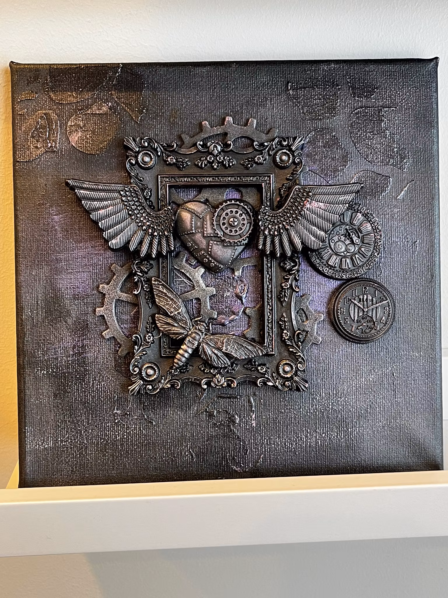 Handgjord tavla med detaljer gjutna i resin och papperslera. Målad med akryl och vax i svart, lila och silver.Ramens mått är20*20 cmTavlan har en träram på baksidan så man kan enkelt hänga den på en spik.