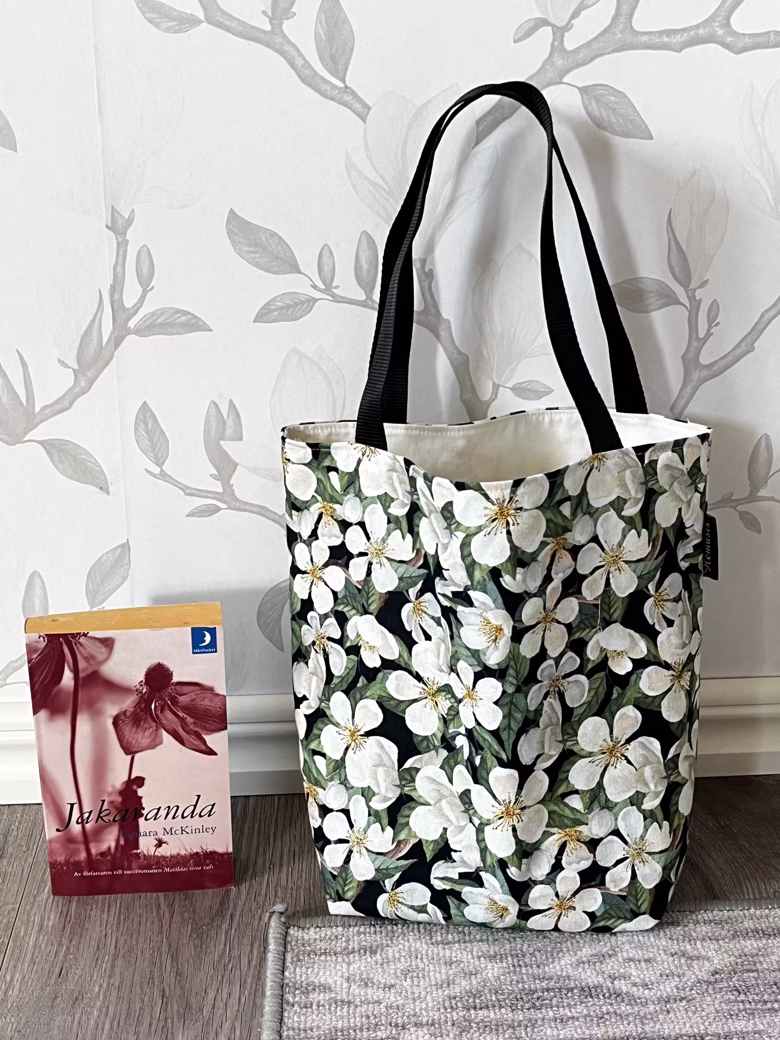 Kasse medium har måtten 33 cm bred, 28 cm hög och 12 cm botten. Banden är ca 45 cm.