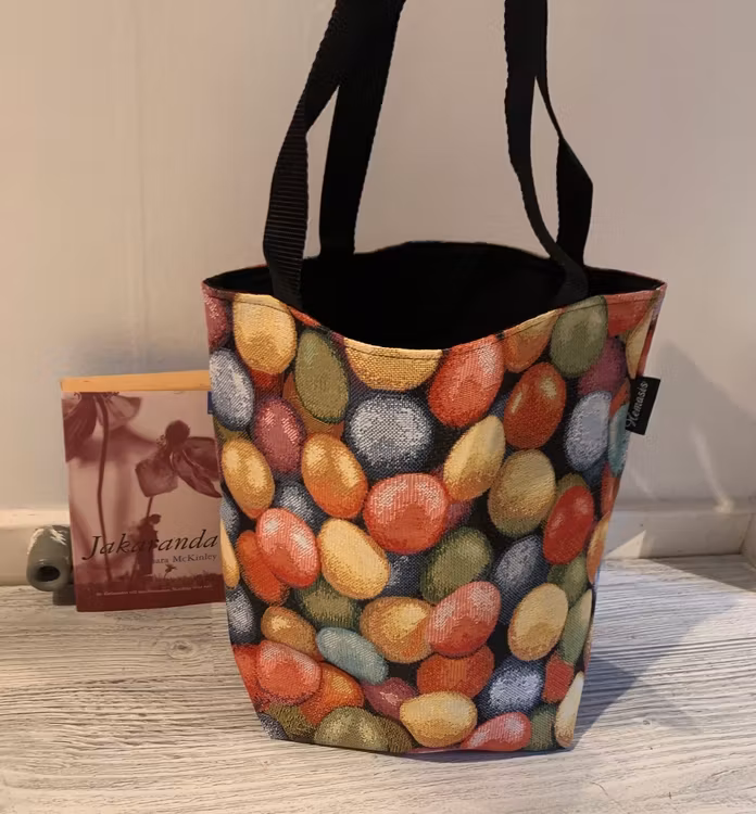 Underbar kasse med färgglada kulor. Fodrad med bomullstyg.