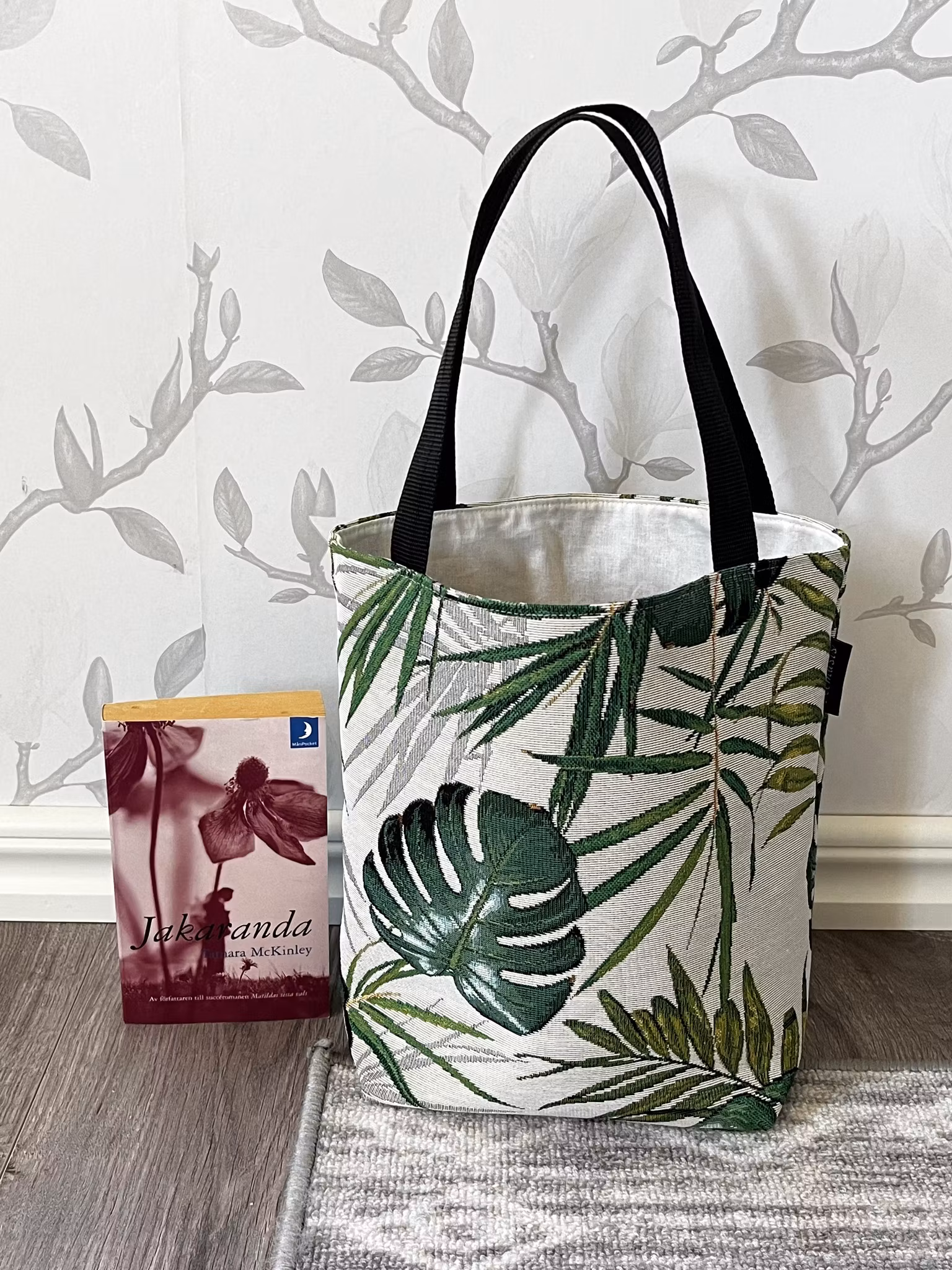Underbar kasse med gröna blad på ljus botten. Fodrad med bomullstyg.