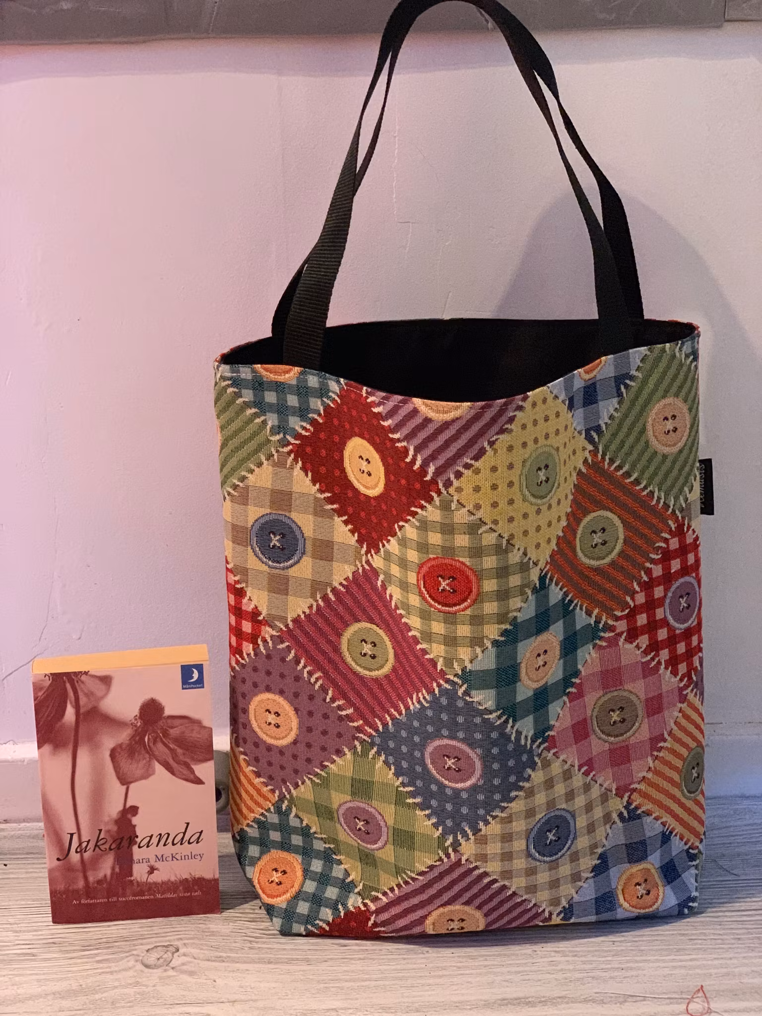 Underbar kasse med knappar. Sydd i tjockare gobelängtyg . Fodrad med bomullstyg.