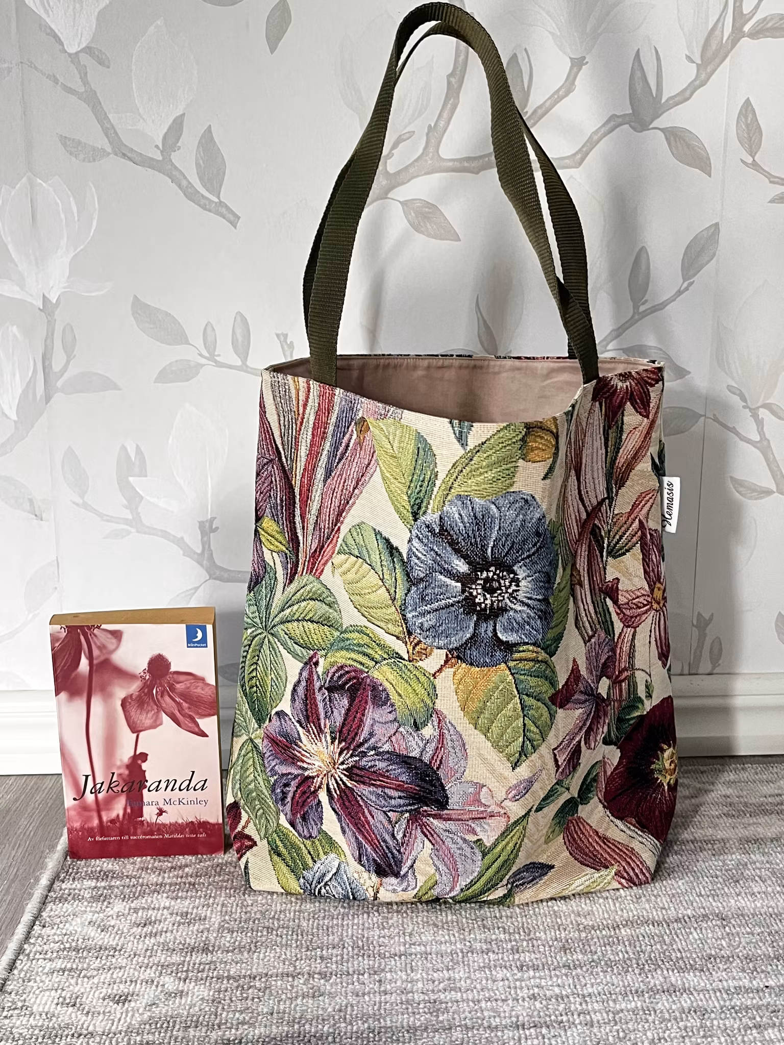Kasse stor har måtten 41 cm bred, 37 cm hög och 12 cm botten. Banden är ca 52 cm.