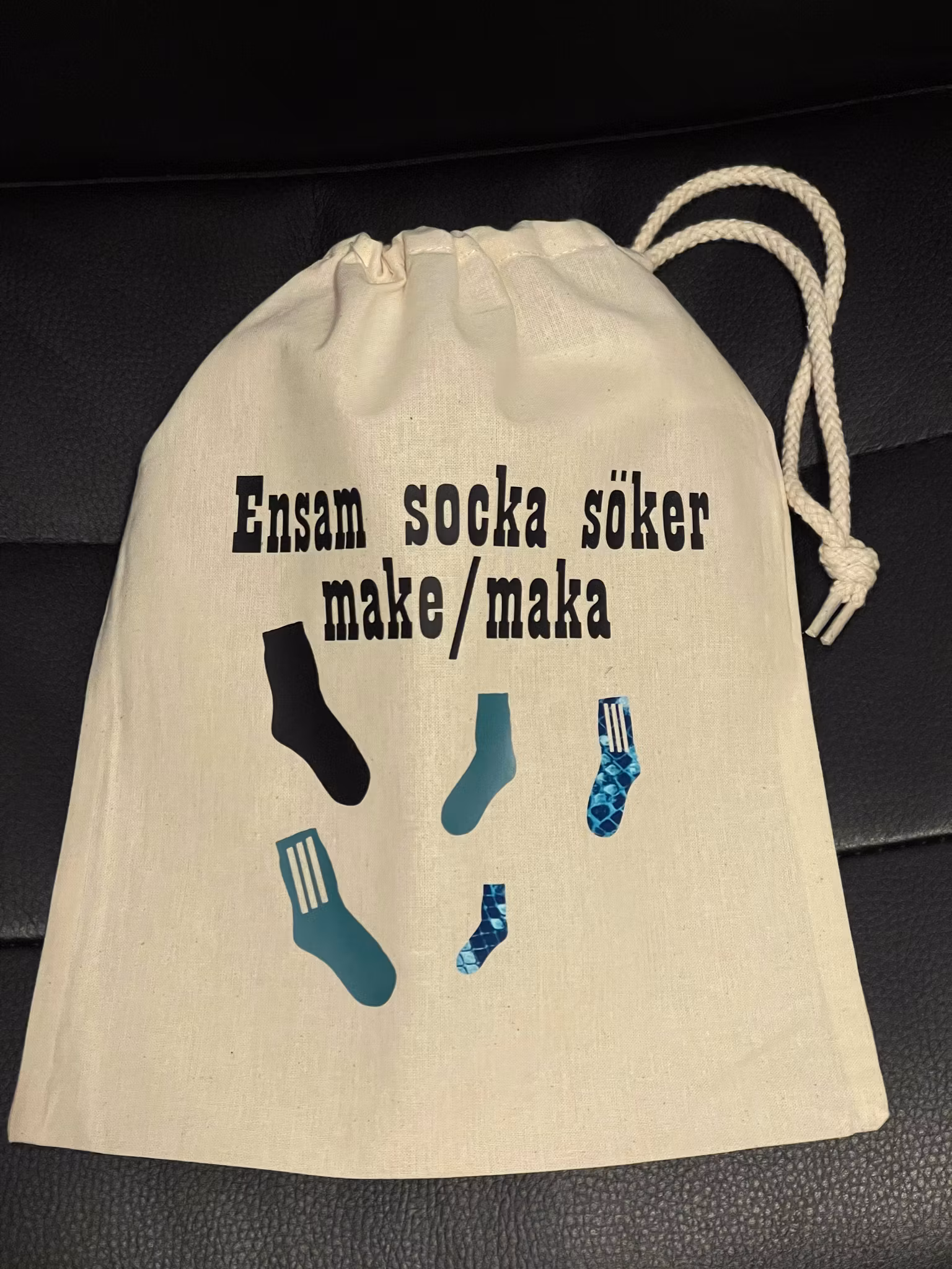 Strump/socksäck med text till den där ena som blir kvar när tvättmaskinen/tumlaren har ätit upp eller gömt den andra identiska strumpan :)Inga säckar är exakt l